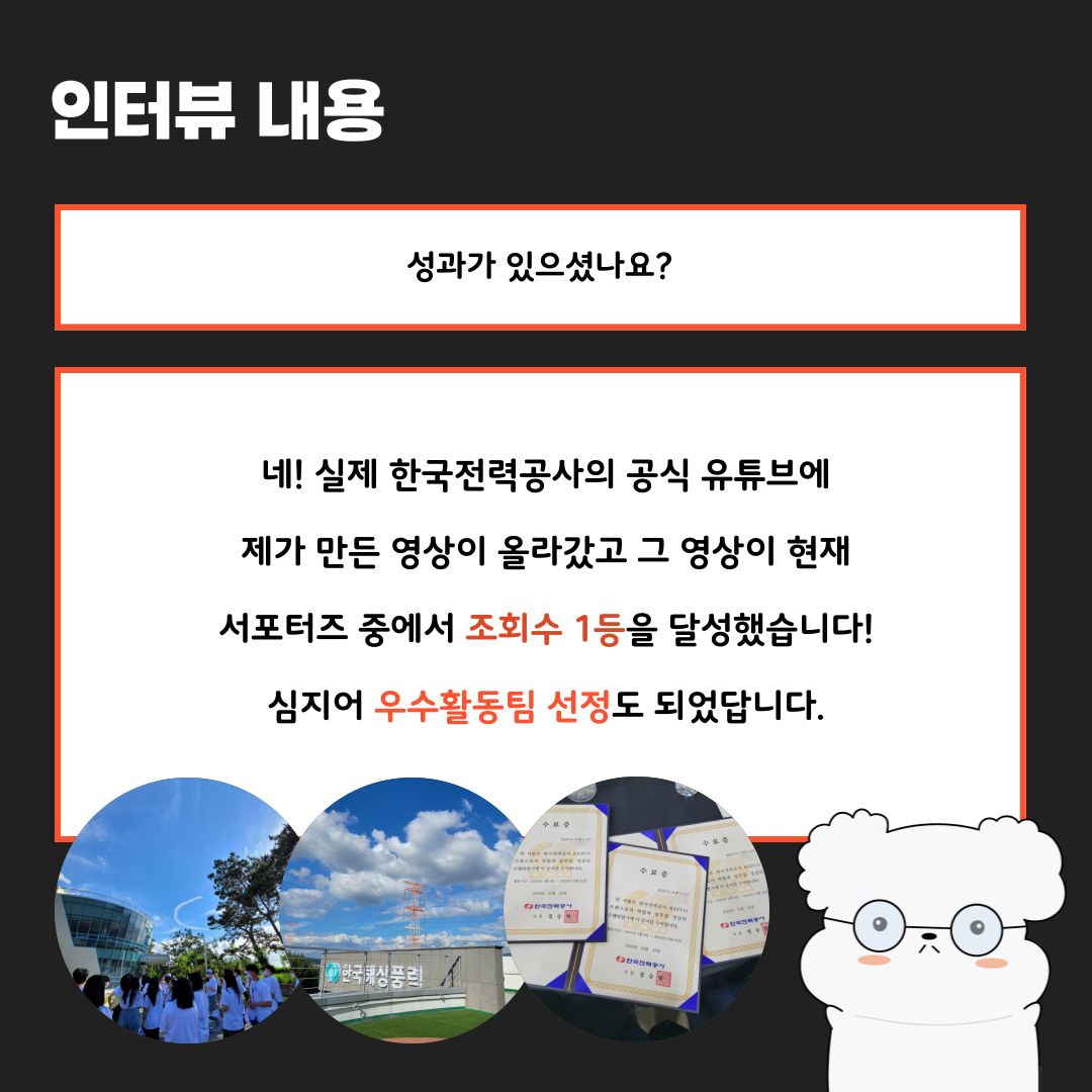 "한전 공식 유튜브에 제가 만든 영상이 올라갔고, 조회수 1등을 기록했어요! 또한, 우수활동팀으로 선정되는 영광도 있었습니다."